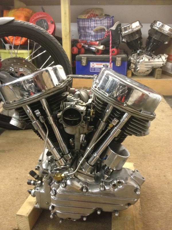 Just took out the 57 pan for a top end rebuild and also to shove in the new Linkert and replace those nasty outside oilers. In the background you can see what looks like a pan but actually the whole bottom end is a 1942EL Knuckle which I have the title, log book for, its for sale Sold if anybody is interested. Thats just the bottom end, I'm keeping the barrels up. You can mail me at automaf@hotmail.co.uk